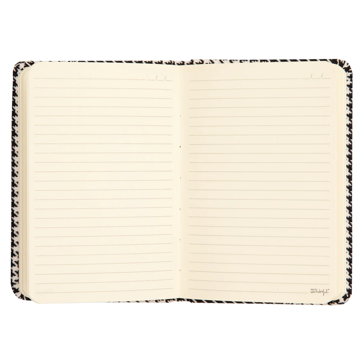 Libreta de tamaño A6 con portada forrada de tela con estampado de pata de gallo. En su interior encontramos 160 páginas pautadas elaboradas con papel de 90gsm. Cuenta con el certificado FSC, que garantiza que ha sido fabricada utilizando papel proveniente de bosques gestionados de forma responsable.