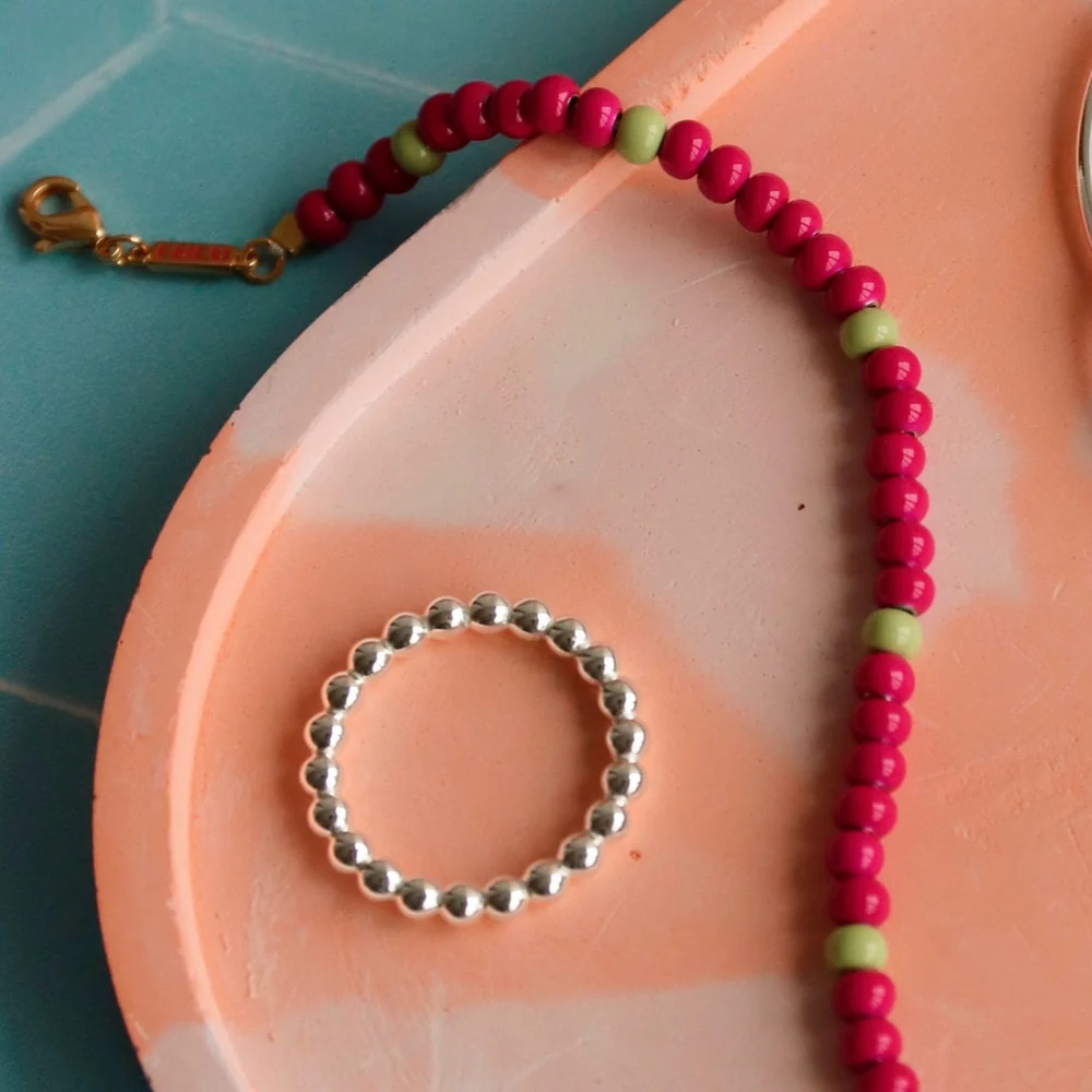 La bague Color Ball de Lulu Copenhagen se distingue par sa succession de petites boules qui composent un anneau doux et graphique. Son design minimaliste, relevé d’une touche de couleur, apporte une note subtile et moderne. Elle se porte aussi bien seule pour un style épuré qu’associée à d’autres bagues pour créer de jolies superpositions. Chaque bague en émail est peinte à la main, ce qui peut provoquer de légères irrégularités ou variations de diamètre (~1 mm) et de couleur, ces petites différences font partie de l’authenticité et de la beauté de chaque bijou. Fabrication en Chine