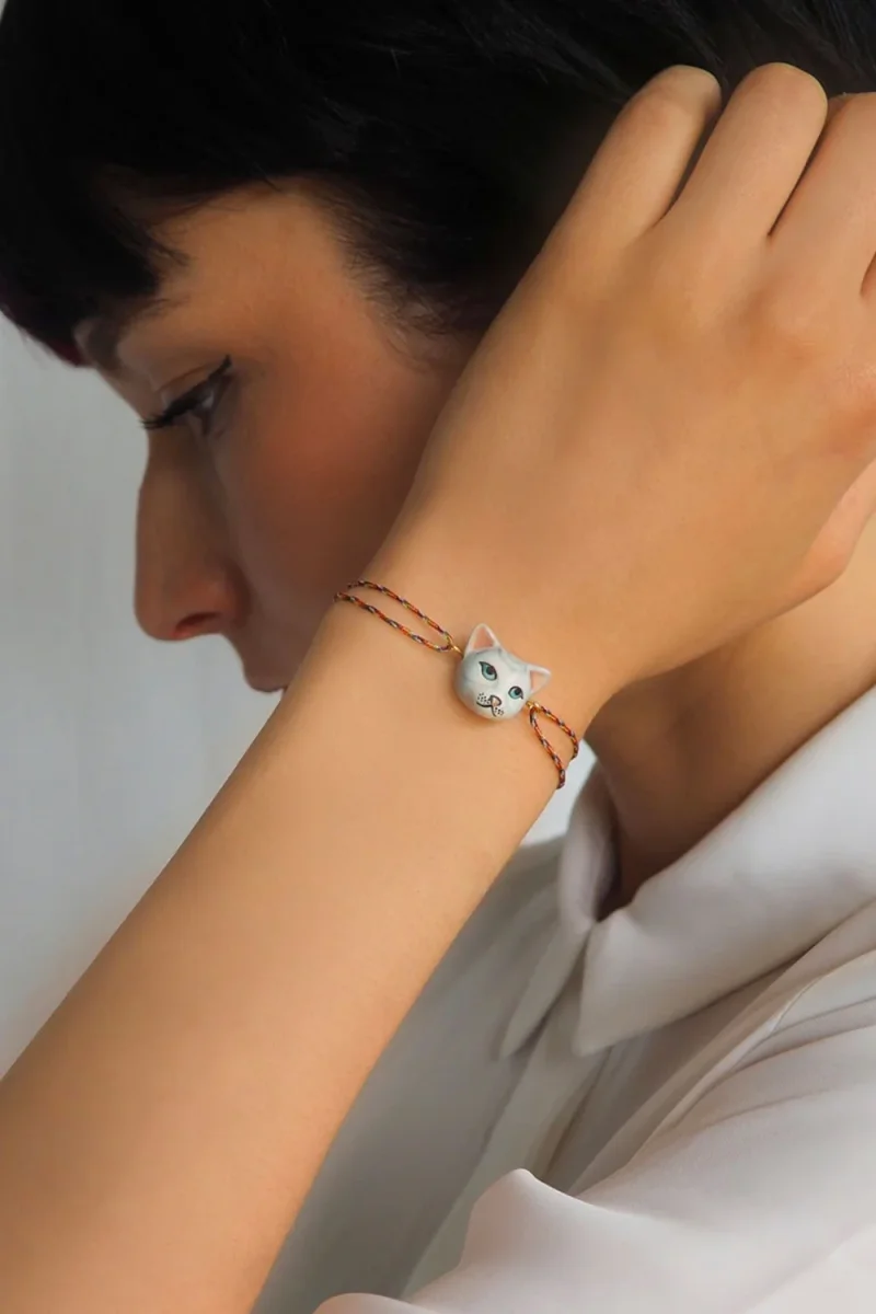 Ce joli bracelet ajustable NACH est composé d’un petit chat tabby en porcelaine, le bracelet est en coton lurex, et les pièces métalliques sont en laiton doré à l’or fin 24 carats. La porcelaine est réalisée et peinte à la main ce qui rend les pièces NACH uniques ! Fabrication en Thaïlande