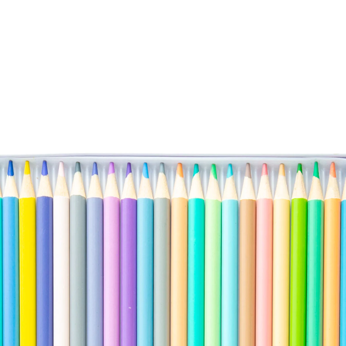 24 lápices de colores de doble punta, se presentan en una caja de lata el mensaje impreso en ella.