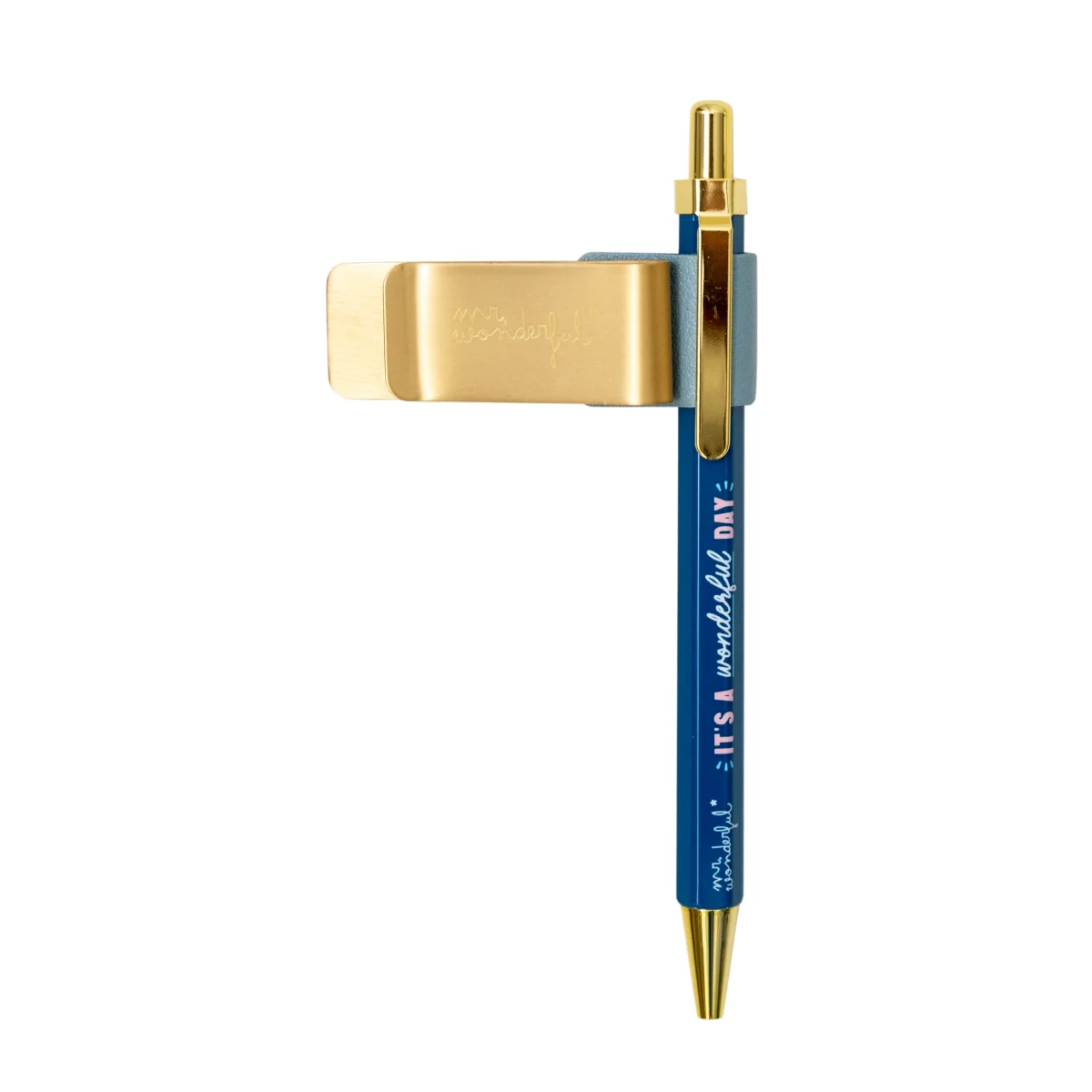 Pinza metálica pensada para engancharla a una libreta o a la agenda y, a la que viene enganchado un bonito bolígrafo con el mensaje: