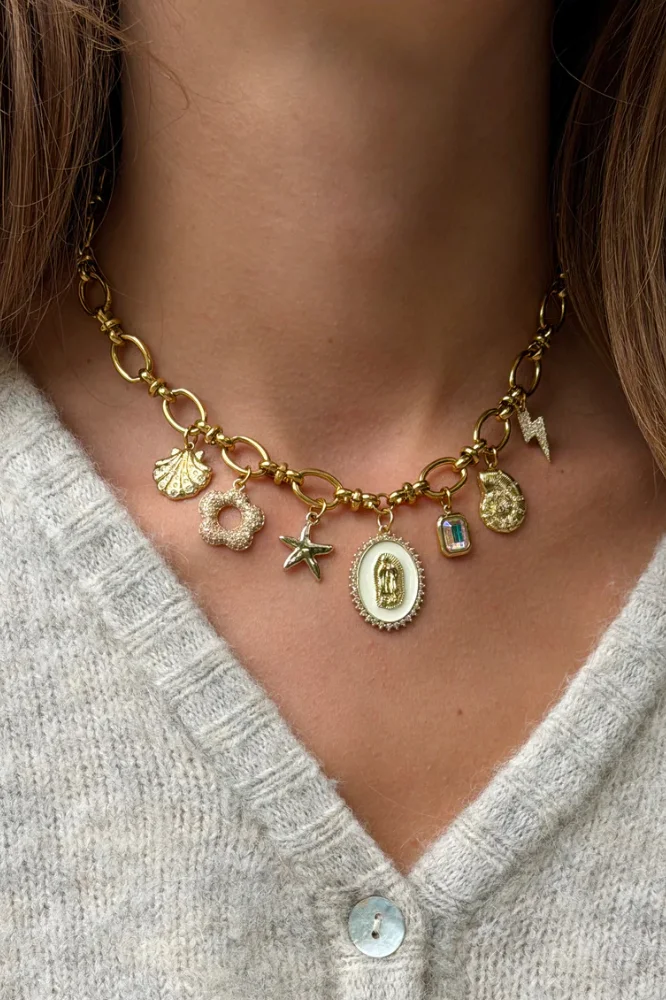 Apportez une touche de fun et de personnalité à vos tenues avec ce collier Mamy Grand en acier inoxydable et laiton doré à l’or fin. Orné de grigris et breloques pleins de charme, il se porte facilement au quotidien et s’accorde à toutes vos tenues. Léger, résistant et pensé pour durer, ce collier ajoute un détail décalé et joyeux à votre style, fidèle à l’esprit unique et audacieux de Mamy Grand. Fabrication en France