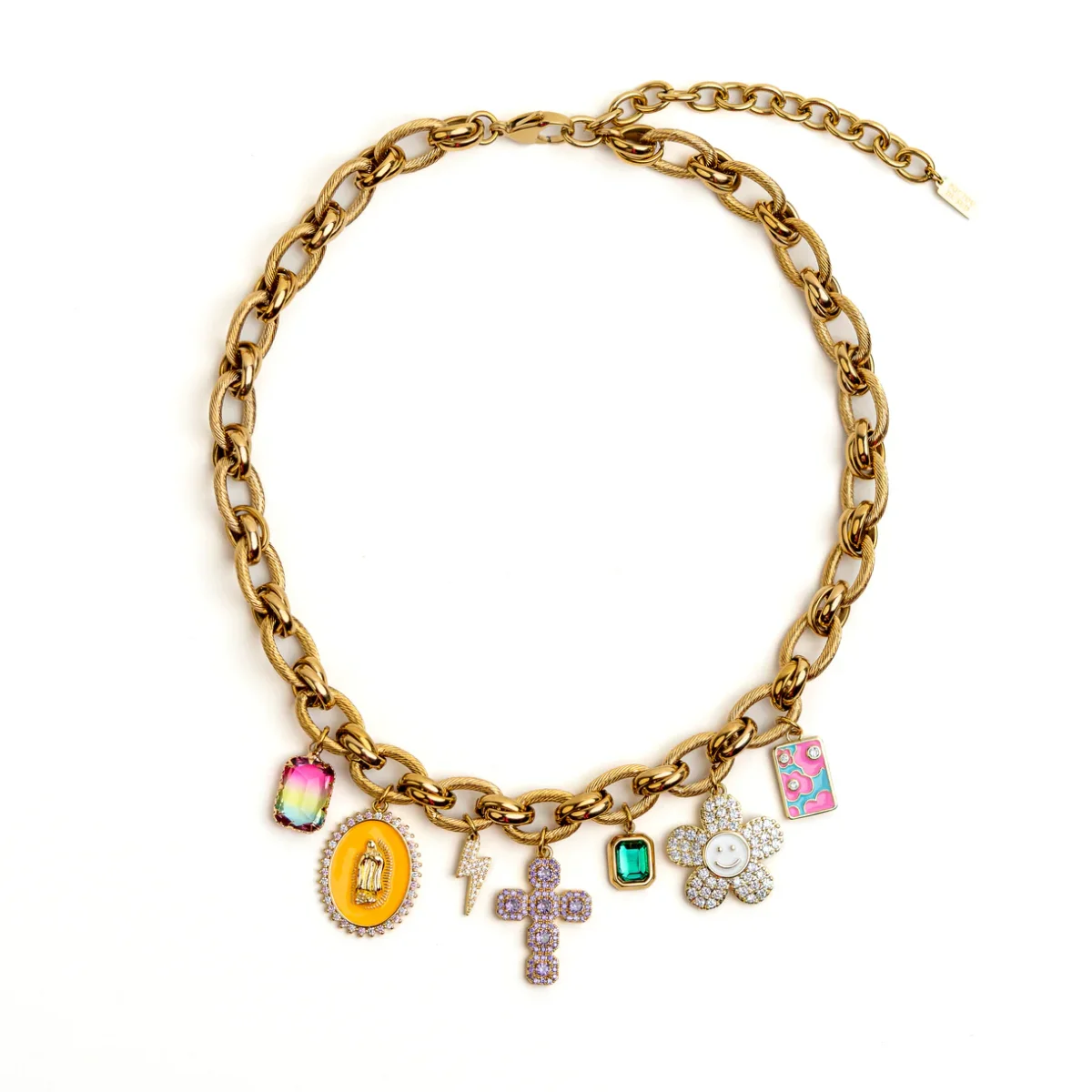 Apportez une touche de fun et de personnalité à vos tenues avec ce collier Mamy Grand en acier inoxydable et laiton doré à l’or fin. Orné de grigris et breloques pleins de charme, il se porte facilement au quotidien et s’accorde à toutes vos tenues. Léger, résistant et pensé pour durer, ce collier ajoute un détail décalé et joyeux à votre style, fidèle à l’esprit unique et audacieux de Mamy Grand. Fabrication en France