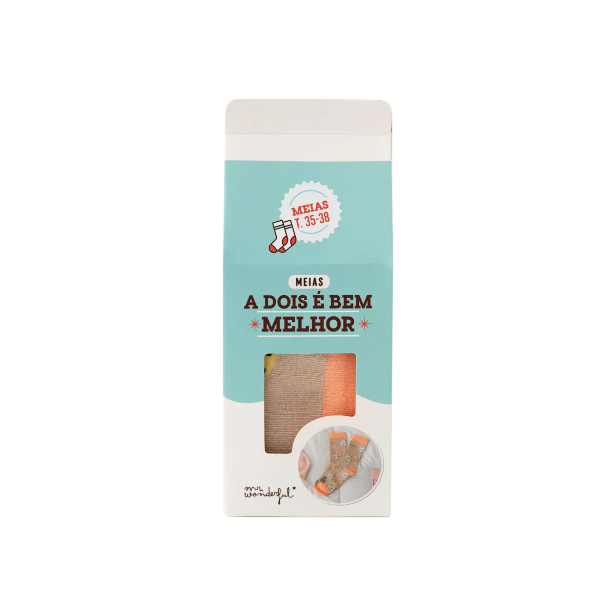 De pouco te servirá ter um GPS supermoderno se não tiveres as meias com mensagem perfeitas que te permitam chegar a qualquer sítio do mundo. Queres saber porque é que estas meias Mr. Wonderful são as ideais para ti e para o teu amorzinho? Porque a sua mensagem vos recorda que o que menos interessa é onde, e que o que realmente importa é sempre a companhia. Quantas vezes já estiveste num sítio a sentir saudades sabes de quem? Claro, porque sabias que, se estivesse ao teu lado nesse momento, o céu seria mais azul, o sol brilharia mais e o gelado que estavas a devorar saberia ainda mais delicioso se estivesse a ser devorado por duas colheres em vez de uma. Quando fazem planos juntos, tudo é muito melhor e até toca uma musiquinha de fundo própria das cenas mais cinematográficas. As páginas das vossas agendas enchem-se de alegria a cada dia que apontam um encontro especial e a caneta até executa uma dancinha superanimada. Para irem a essas saídas bem juntinhos, desenhámo-las especialmente para vocês com o mesmo amor em rosa e em azul. Só resta selecionar cor e tamanho para cada um e… toca a aproveitar ao máximo os vossos planos partilhados!