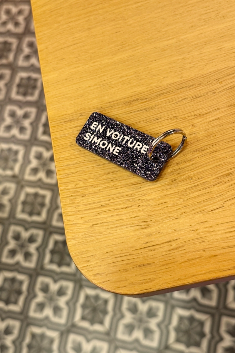 Porte-clés pailleté ‘En voiture Simone’ Noir | PLUS DE LOVE