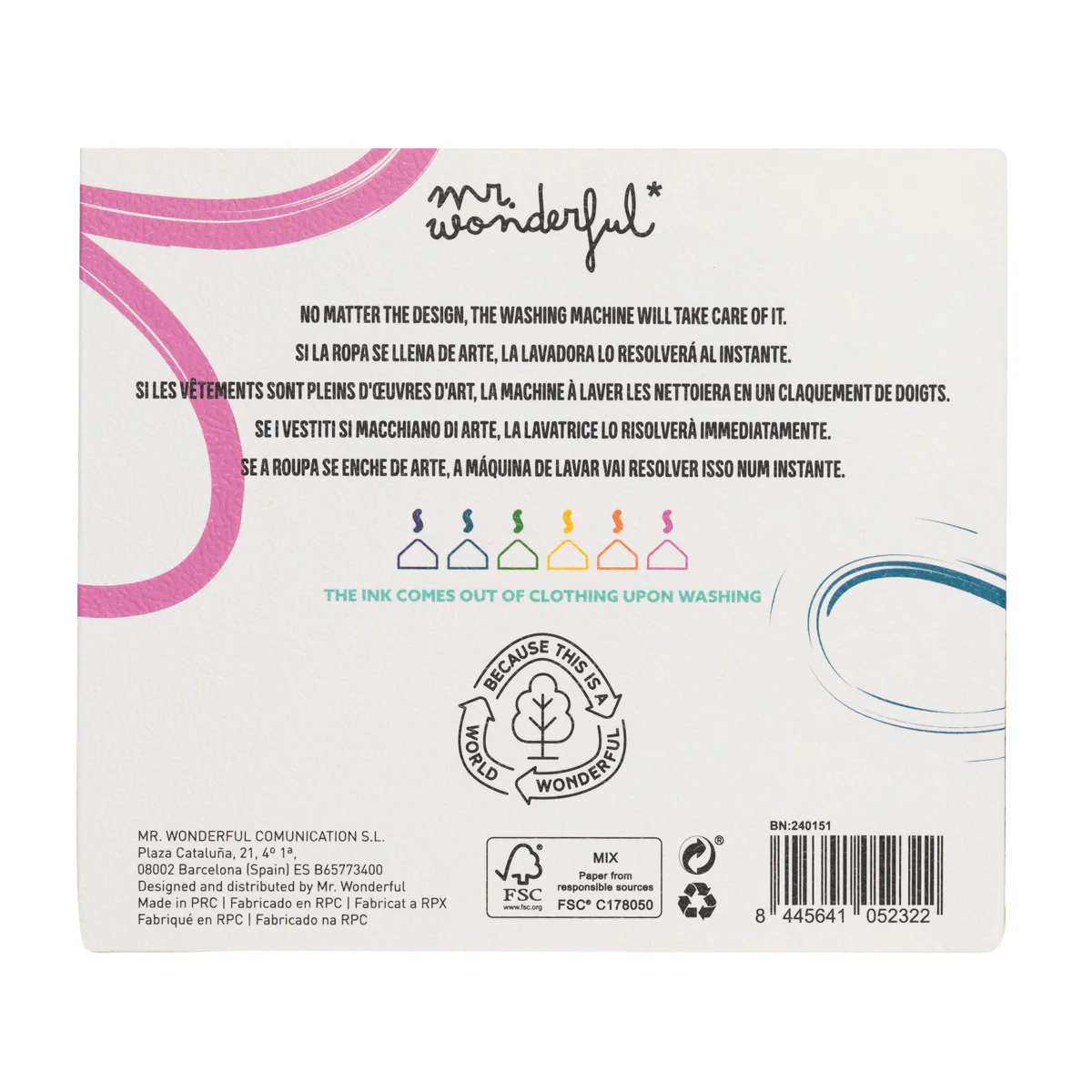To HTML Set de 6 rotuladores con tinta lavable: si se mancha la ropa, se puede lavar.Importante: la tinta es lavable en la ropa, pero puede permanecer en otras superficies.Colores de las tintas: lila, azul, verde, amarillo, naranja y rosa. Permite que el artista de la casa deje volar su imaginación… ¡sin miedo!