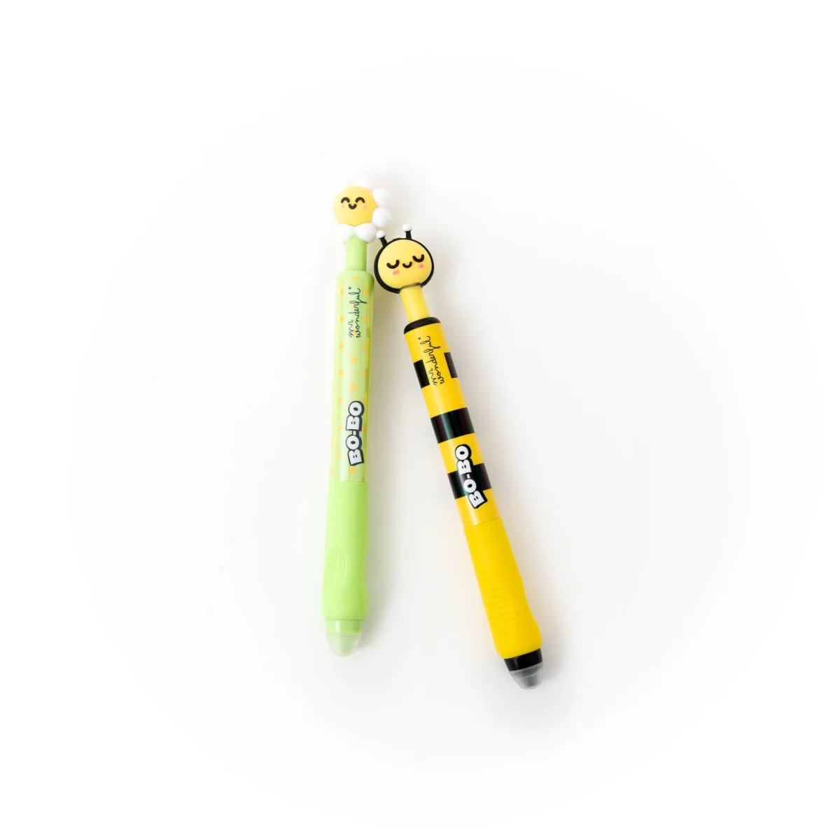 Set de 2 bolis borrables Bo-Bo Click con la margarita y la abeja como protagonista. El mensaje de los mensajes de los bolígrafos: