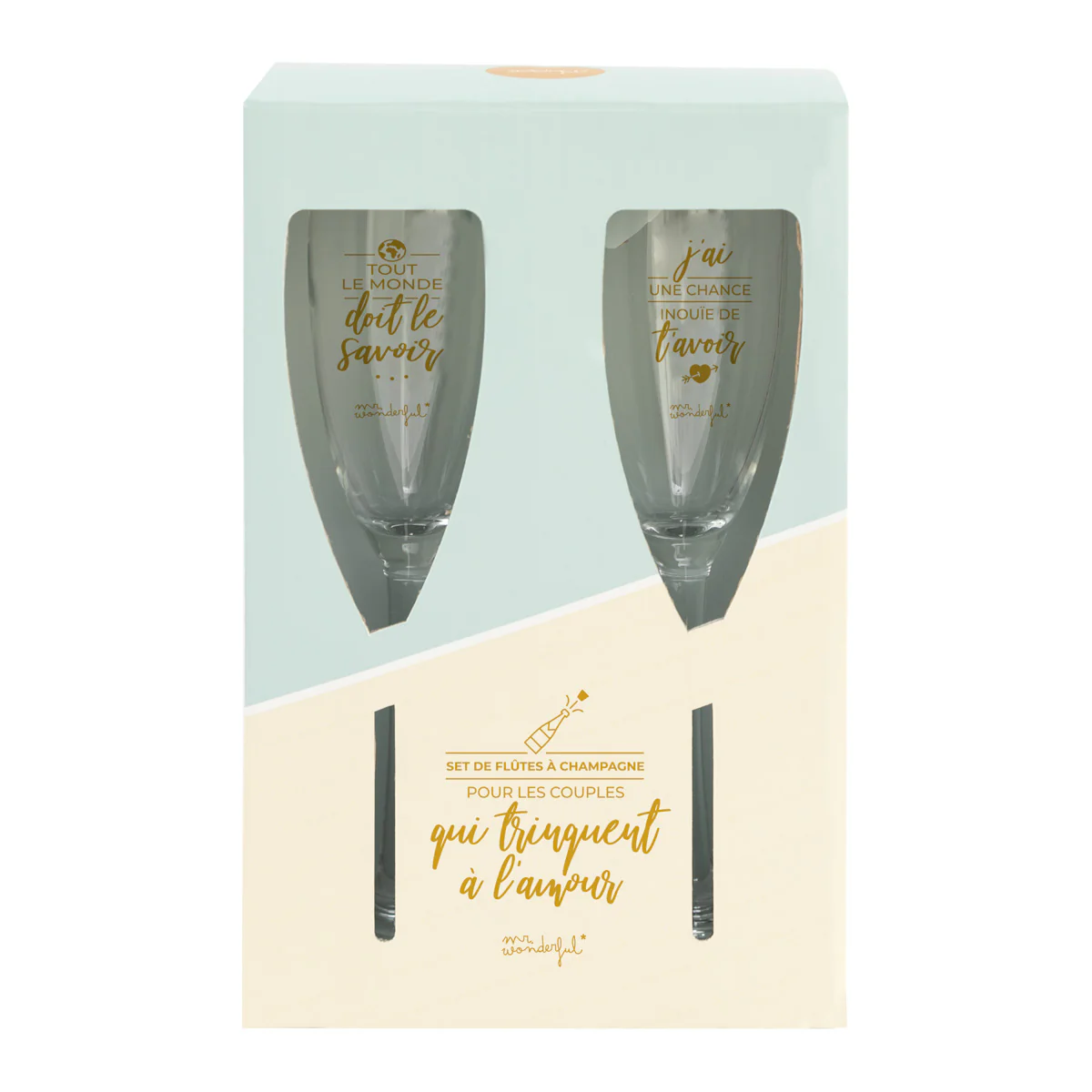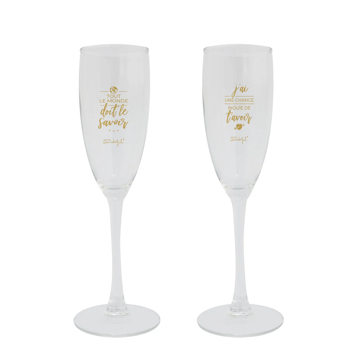 Set de deux coupes à champagne, avec un message d’amour partagé entre les deux verres. Idéal comme cadeau pour les mariés.