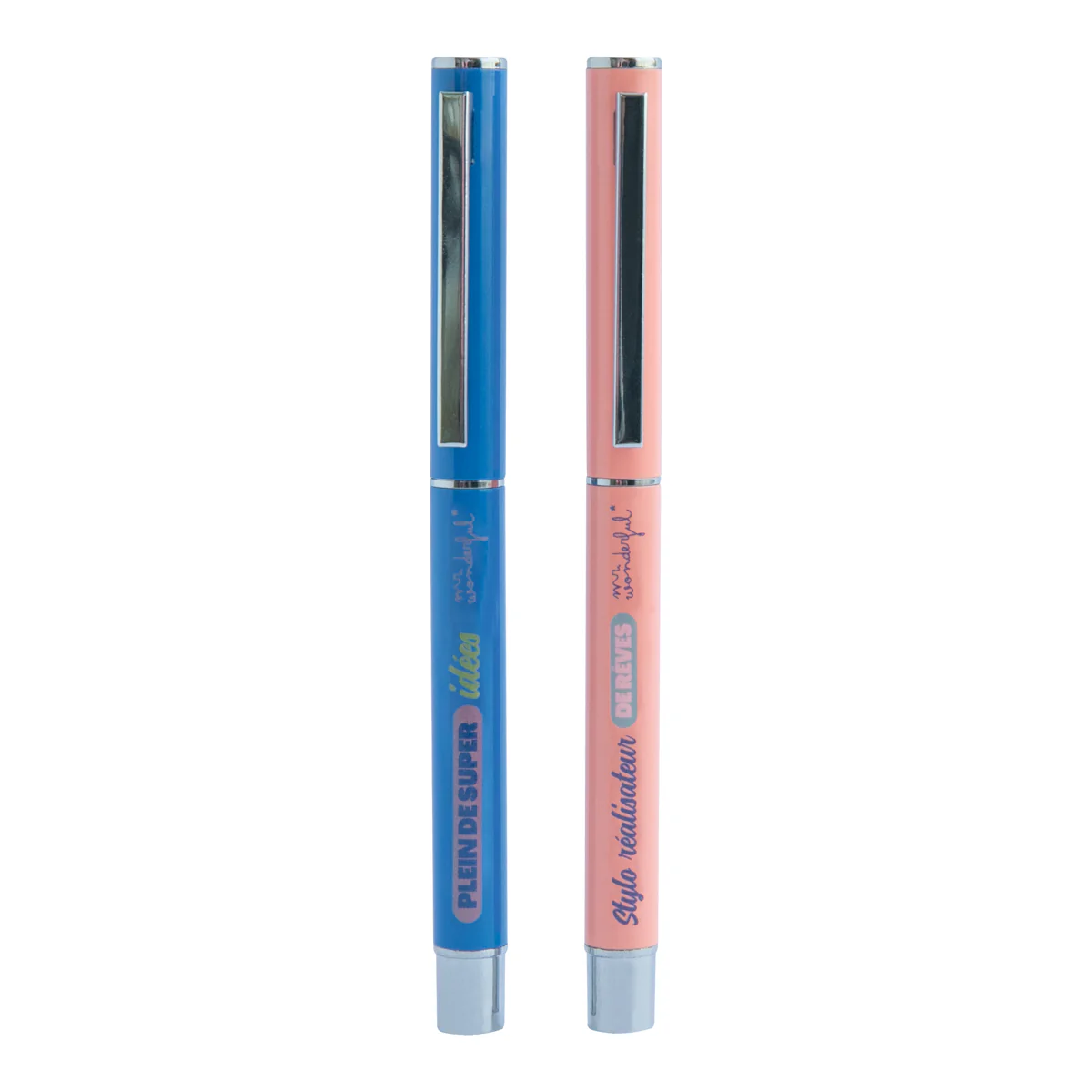 Set de 2 stylos Mr. Wonderful avec des messages en français. L’encre est respectivement noire et bleue.