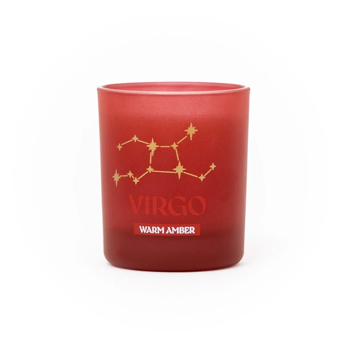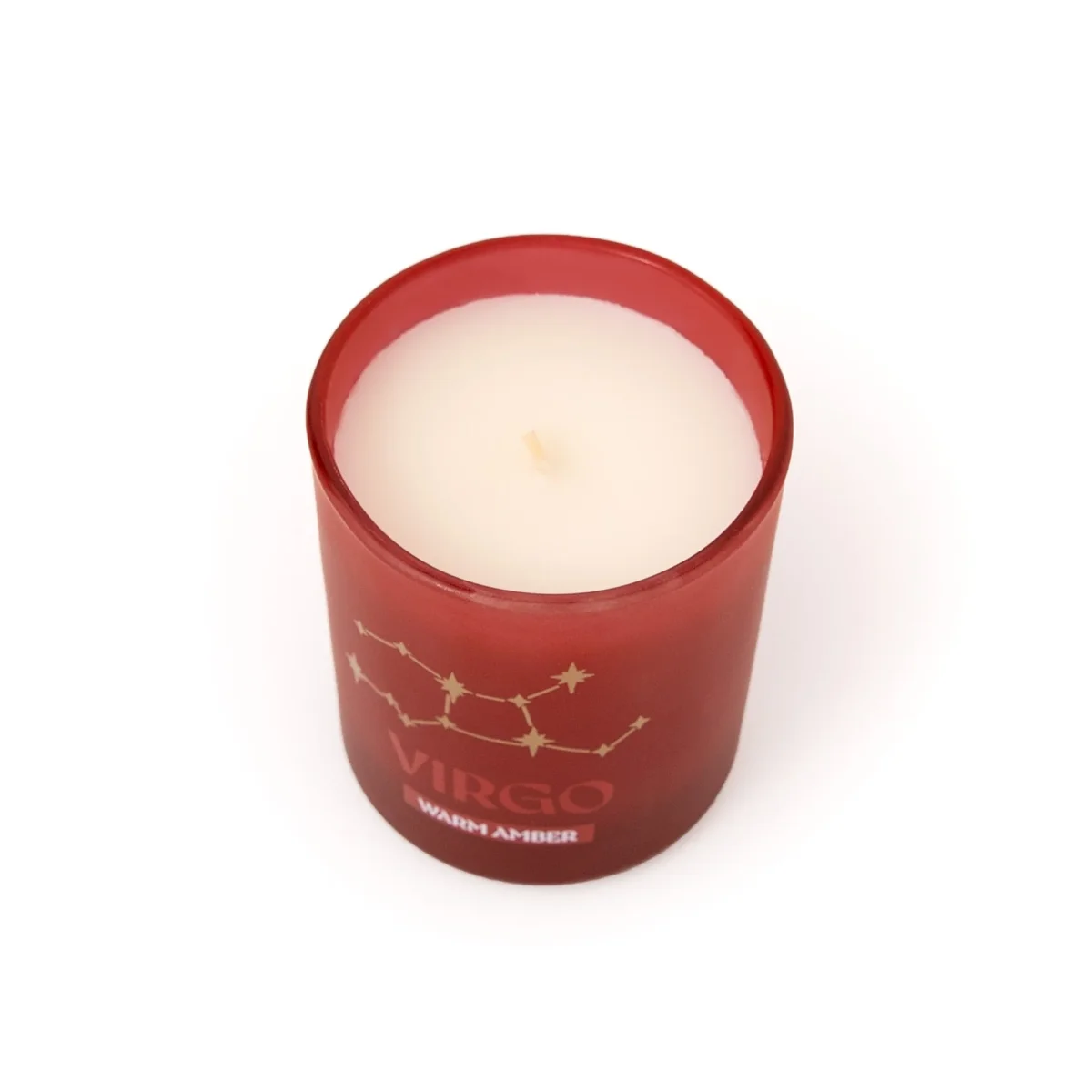 Vela perfumada con aroma a Warm amber. Se presenta en un envase de vidrio en el que se ilustra el nombre en inglés y la constelación del signo zodiacal de Virgo.